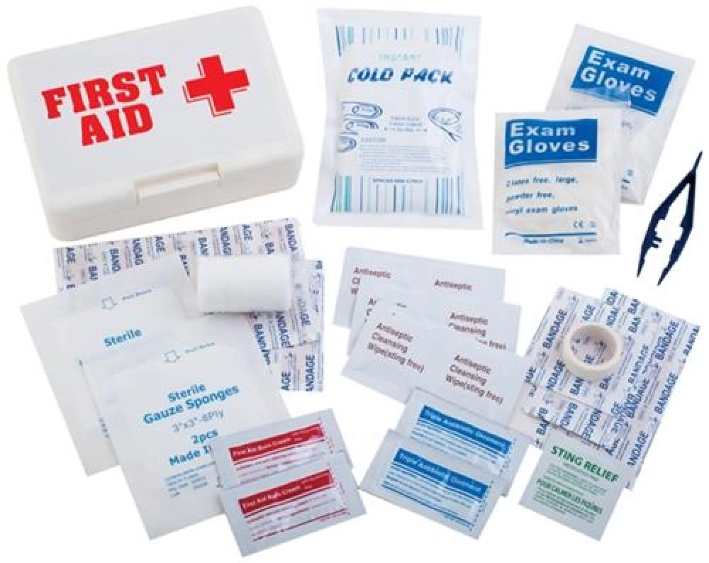 First aid kit contains basic supplies for minor medical emergencies. Specifically designed for sports and recreational events. Includes durable weather resistant case.