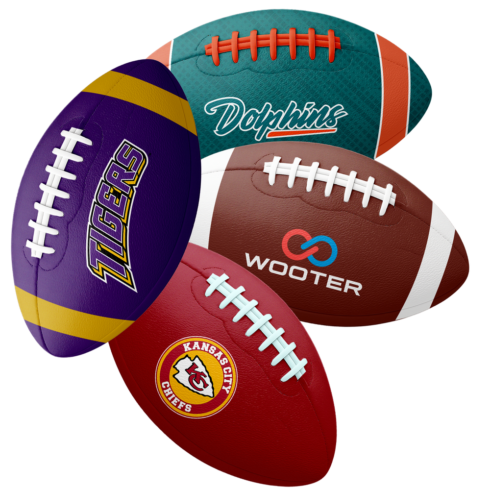 Whether you're gearing up for a youth league or outfitting your high school team, Wooter's custom footballs deliver quality, durability, and performance. Available in a variety of sizes for different age groups, our footballs provide the ideal fit and feel for every player. Each ball can be personalized with your team's design, making them unique to your squad.